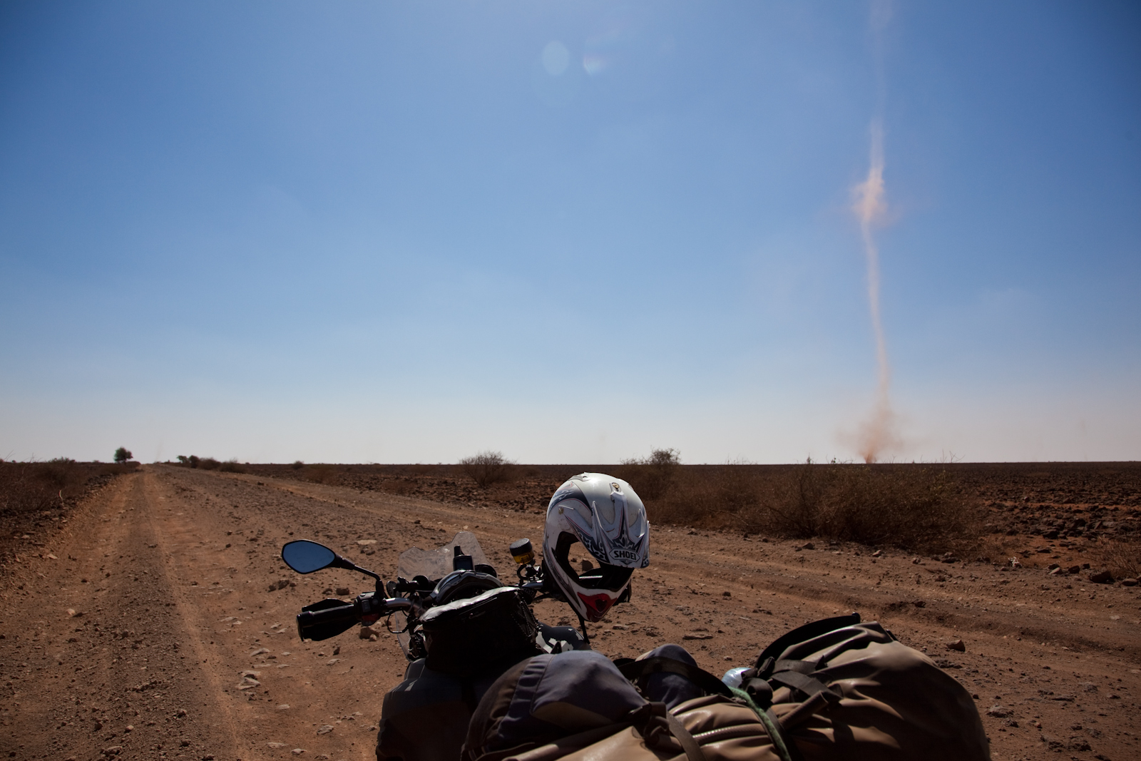 Je réussis à me vautrer qu'une seule fois, et c'est pas grâce aux 4x4 de l'ONU qui roulent à donf sur la tôle ondulée (ils s'en foutent de casser leur caisse, elle est pas à eux), me croisent ou dépassent à quelques centimètres et projettent des grosses pierres qui manquent ma bécane (et me genoux) de peu. Vu mon départ tardif, à cause des procédures de douanes du coté éthiopien, et le temps de trouver un hôtel pour Cécile, il me manque 1 heure pour arriver à Marsabit et je préfère camper dans la pampa que de rouler de nuit. Déjà que de jour c'est tendu, alors de nuit..